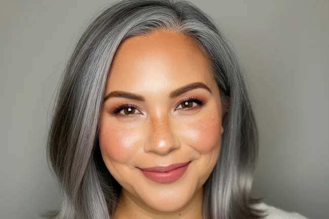 This style blends ash-gray tones with soft brown or dark blonde roots, creating a seamless and natural effect. Perfect for a low-maintenance look.
